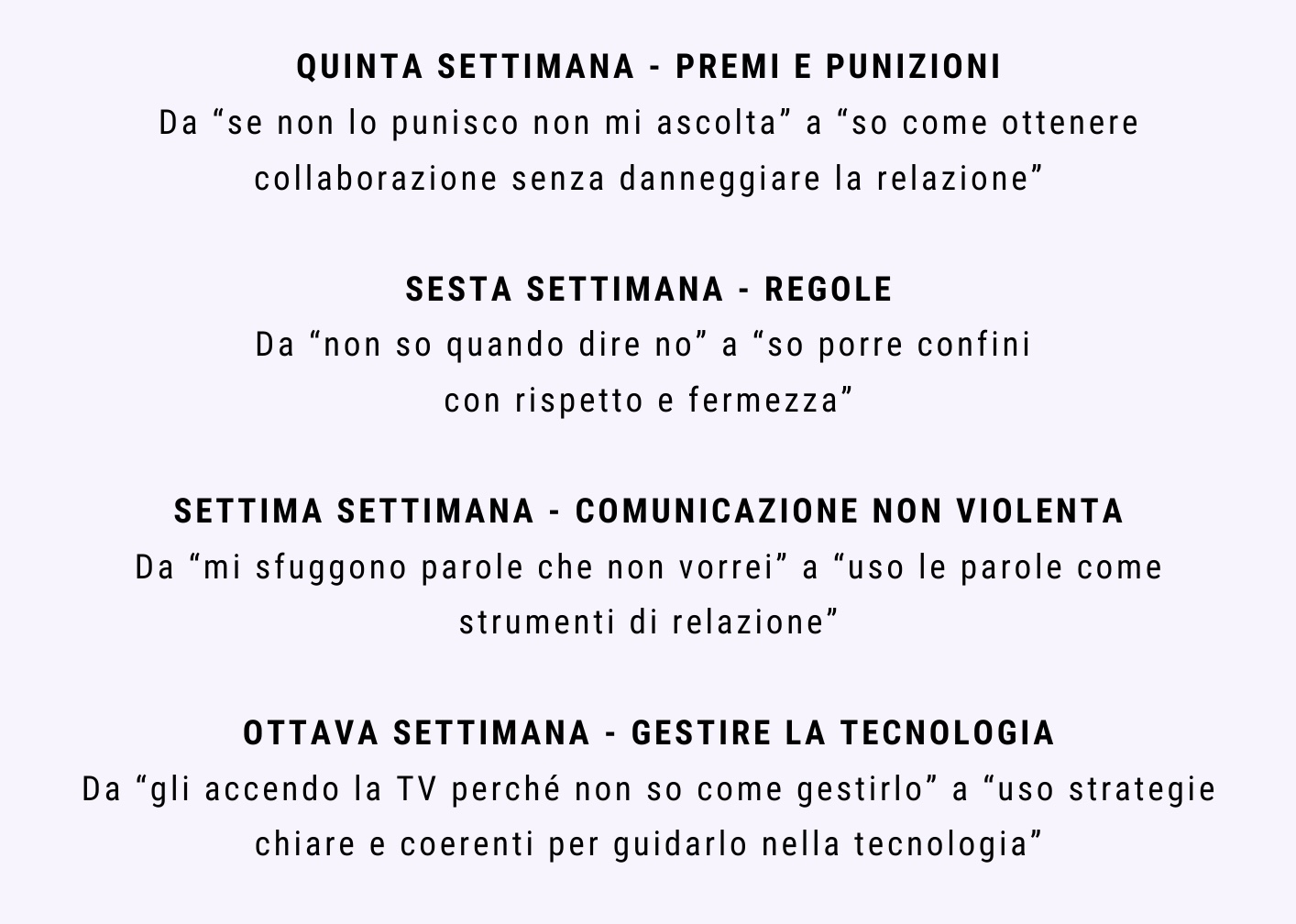 Tutto il percorso è pensato per aiutare i genitori nelle loro giornate impegnative, pertanto il mio impegno è quello di evitare la sensazione di sopraffazione, ma al contrario guidarvi passo passo nel vostro nuovo percorso!